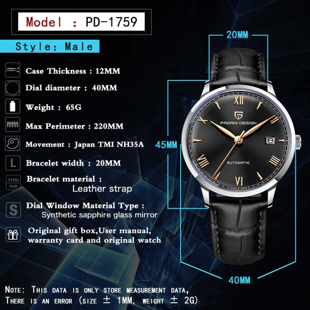 PAGANI DESIGN PD-1759 Leather Men’s Automatic Watches 40mm Sapphire Glass