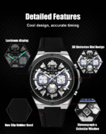 - Regular timekeeping Analog: 3 hands (hour, minute (hand moves every 10 seconds), second), 4 dials (24-hour, day, dual time hour and minute, dual time 24-hour)